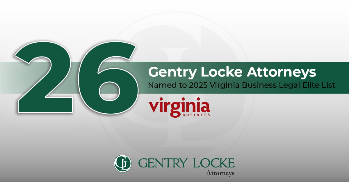 ROANOKE, Va. (December 2, 2025) – The Virginia law firm Gentry Locke is pleased to announce that 26 attorneys have been named to Virginia Business magazine’s 2025 Legal Elite list. The list is determined by peer votes and is divided into 21 legal specialties. The Gentry Locke attorneys recognized in the 2025 Legal Elite list and the areas in which they are recognized include: David R. Berry – Appellate Law Thomas J. Bondurant, Jr. – Criminal Law Karen L. Cohen – Real Estate/Land Use John G. Danyluk – Cybersecurity & Data Privacy Technology Chip (John G.) Dicks – Administrative/Government/Legislative Michael J. Finney – Business […]