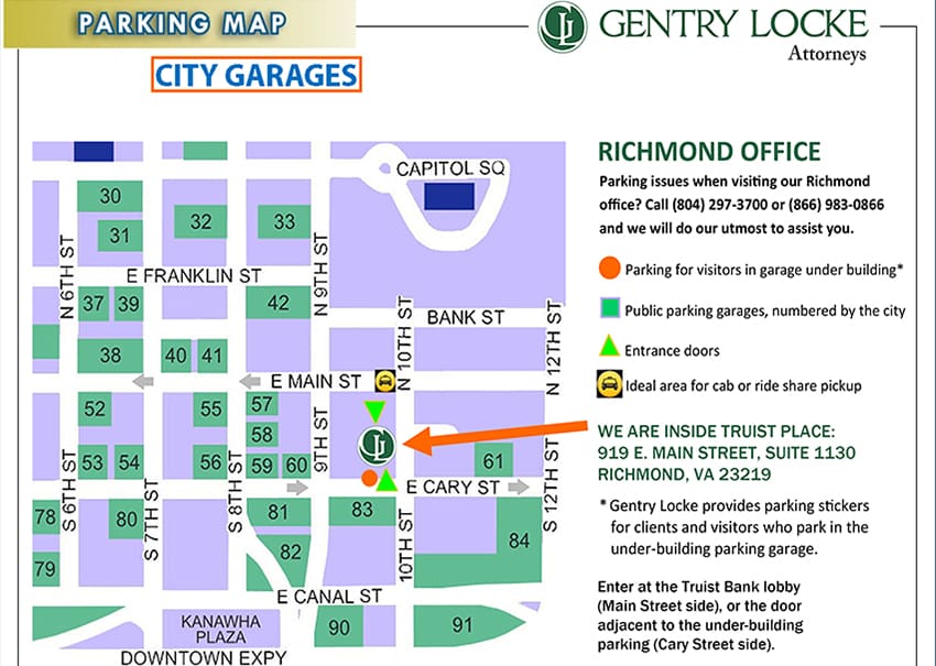We have prepared materials to help you understand the many parking options when visiting our firm. Of course, if you are having any difficulties in coming to see us, we encourage you to call our Receptionist at (804) 297-3700 or (866) 983-0866, or call your Gentry Locke attorney directly. We will be happy to assist you.
